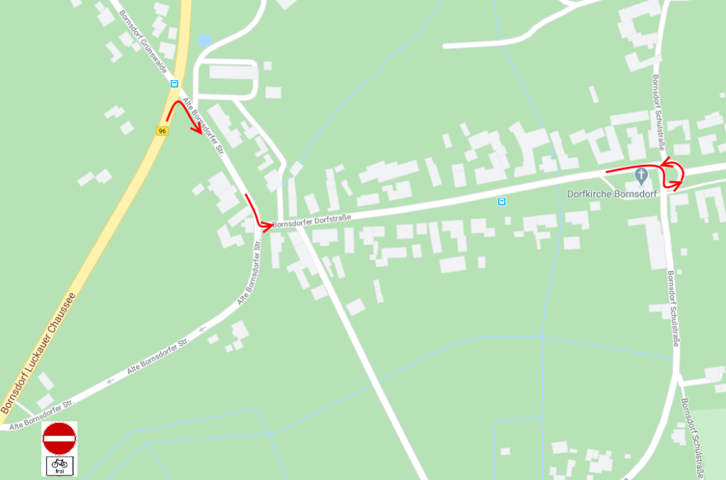 Wendevorgang in Bornsdorf – von Sonnewalde aus kommend unmittelbar vor der Haltestelle rechts – danach links und der Dorfstraße folgen – an der Kirche wenden und wieder zurück.