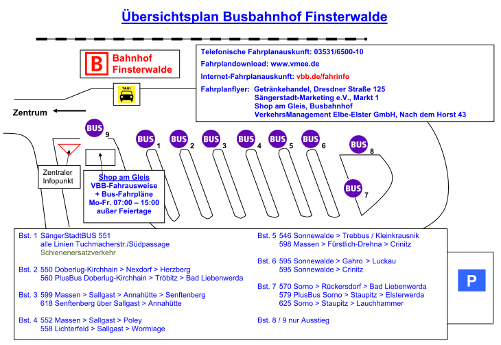 HinweisACHTUNG – alle am Bahnhof Finsterwalde ankommenden Linien mit Weiterfahrt zu den Haltestellen Tuchmacherstr. / Südpassage fahren vom Bussteig 1 ab.